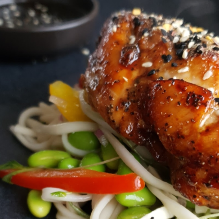 Poached sesame chicken, broccoli, kimchi, baby corn, steamed white rice, dark miso dressing (gf)