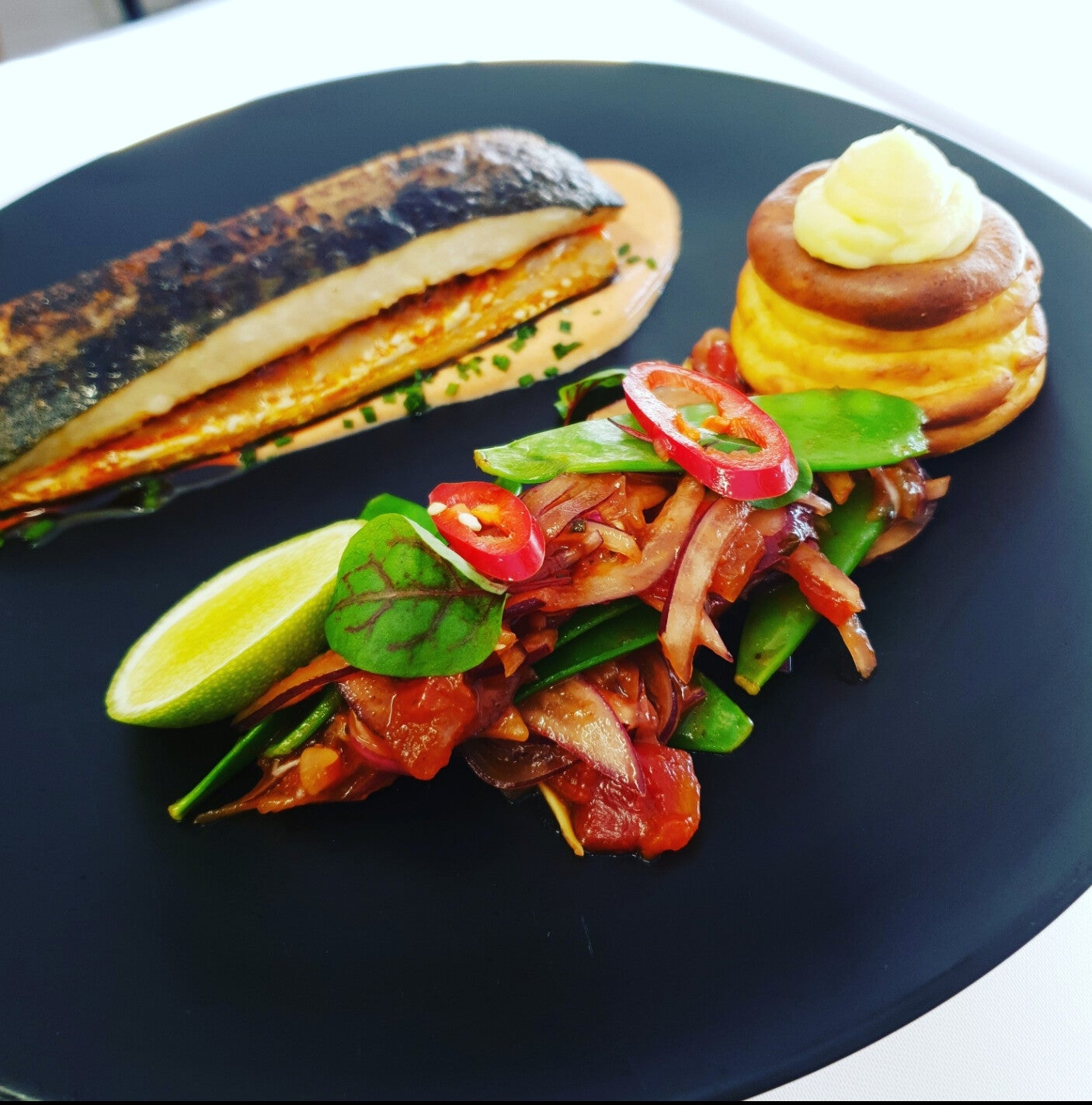 Sea bass fillet with herb butter, served with seasonal vegetables.